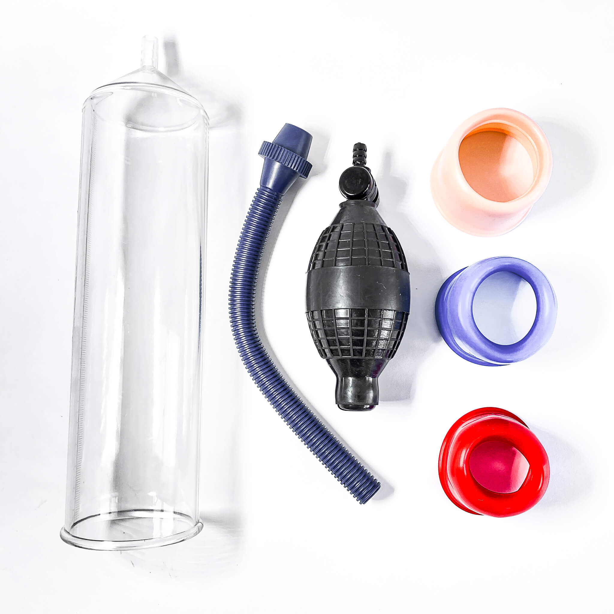 This enlarging device features a clear pump cylinder with ruler markings on the side so you can watch yourself grow and keep track of the gains. The clear cylinder fits over the penis and a couple of squeezes on the soft bulb create a partial vacuum around your penis. This draws blood to the penis strengthening the tissue and causing an erection. Continued pumping increases the vacuum around the penis which can quickly be released via the quick-release valve. For comfort during use, make sure to choose and use the most comfortable of the three differently-sized cylinder sleeves included. They'll slip easily into the mouth of the cylinder and keep a snug fit around your penis.